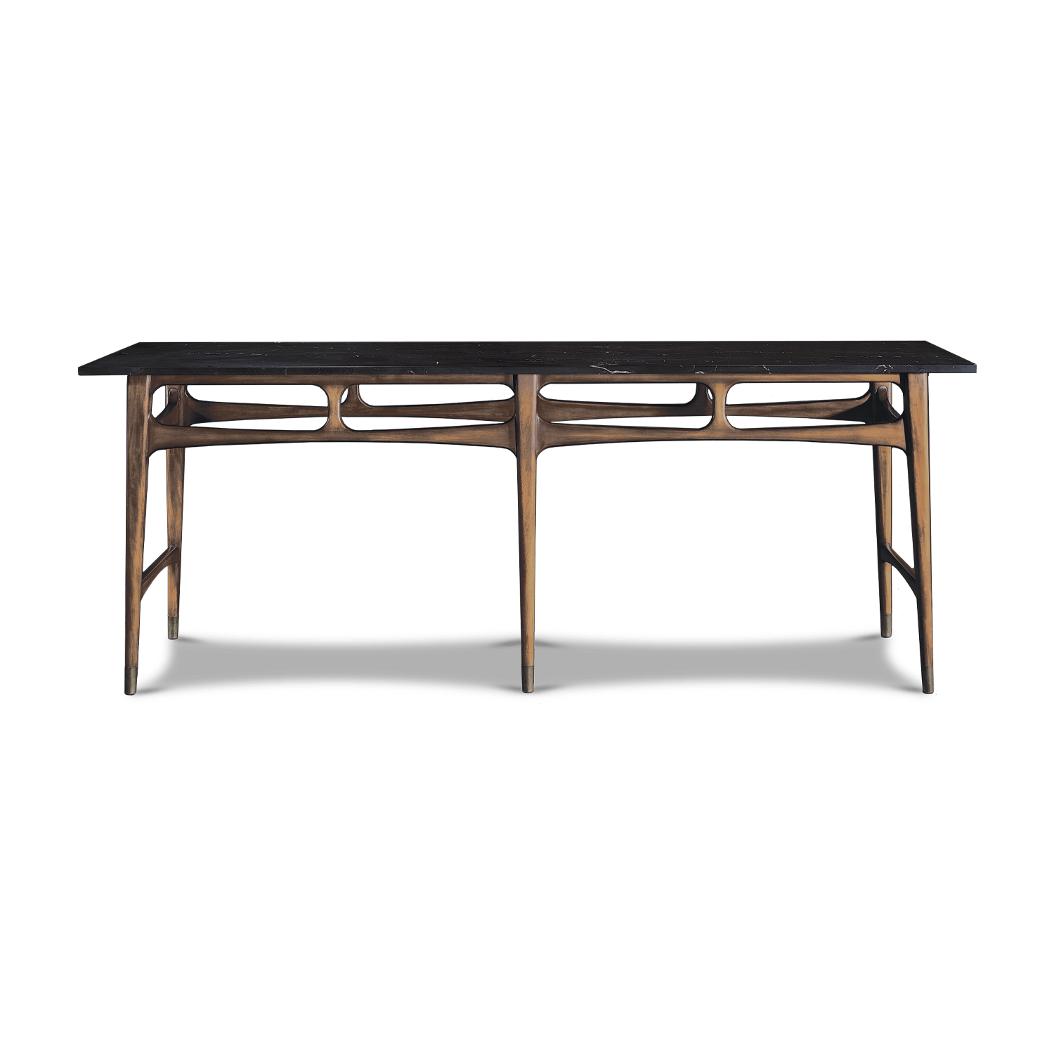 La consola Alzey tiene un diseño moderno de mediados del siglo. Cuenta con una cubierta de mármol que contrasta con su base de madera, creando una armoniosa fusión de materiales. Los casquillos de latón en las patas reflejan la tendencia de la época de combinar diferentes materiales. Desde la elegante superficie de mármol hasta los detalles de latón en las patas, los elementos de diseño de esta mesa capturan a la perfección el espíritu innovador de la era de mediados del siglo, en la que la funcionalidad se entrelazaba con el lujo, y los materiales se combinaban para crear piezas de mobiliario atemporales y elegantes.
