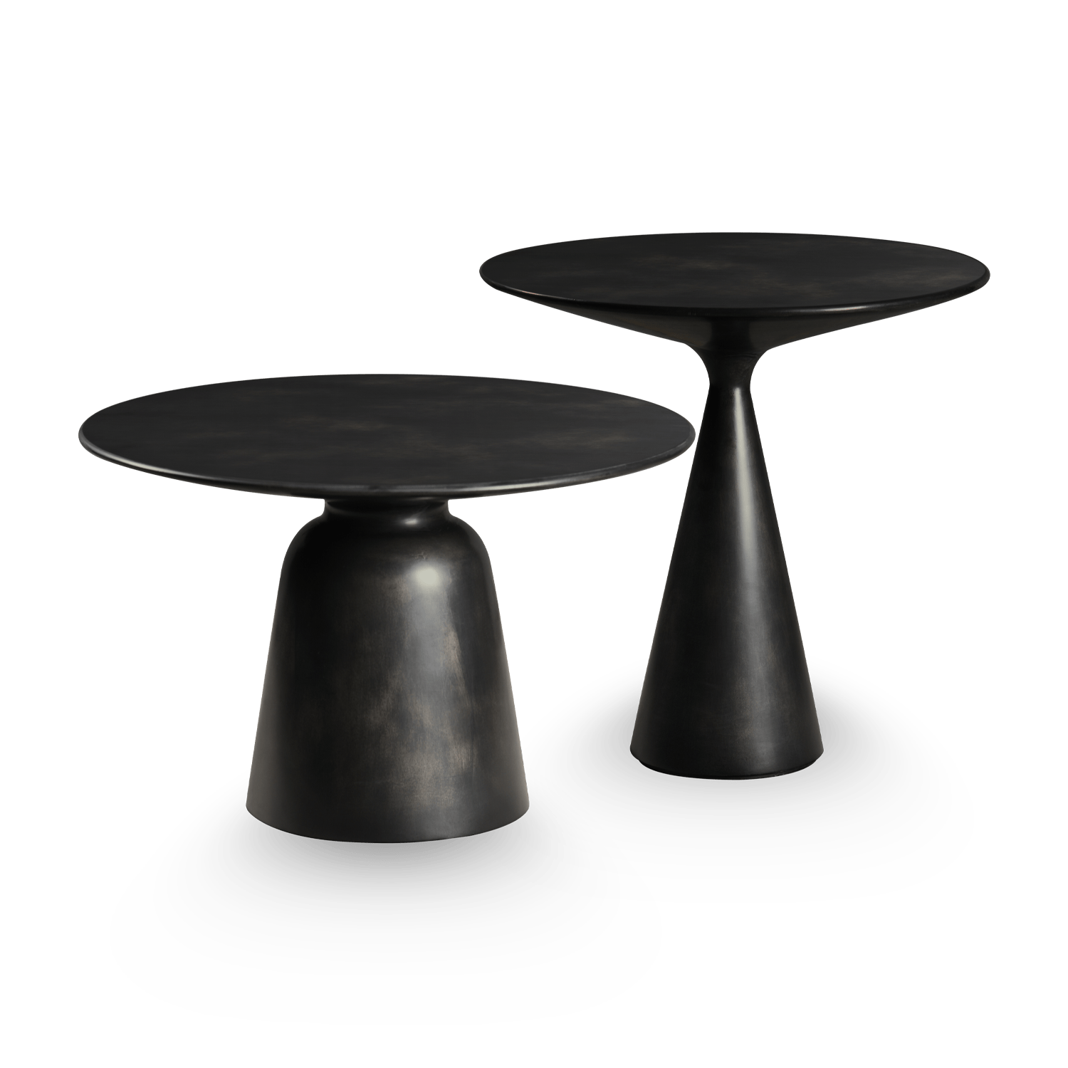 Estas dos mesas de madera se complementan perfectamente. Una es más alta y tiene una base cónica y la otra es más baja, más ancha y tiene una base en forma de campana. El acabado parece metal pulido pero está completamente hecho de madera.
