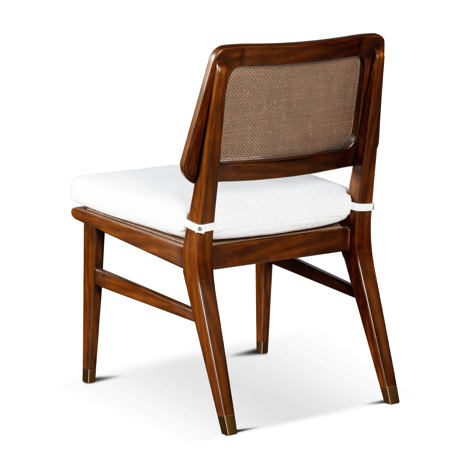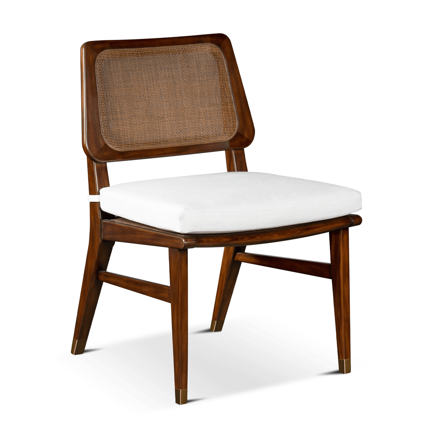 La silla Gironde, inspirada en los años 70, es un complemento informal para cualquier comedor o salón. El respaldo en forma de trapecio tiene una estructura de madera con respaldo de doble caña. Sus patas puntiagudas están decoradas con remates de latón envejecido que confieren a esta silla un aspecto refinado.