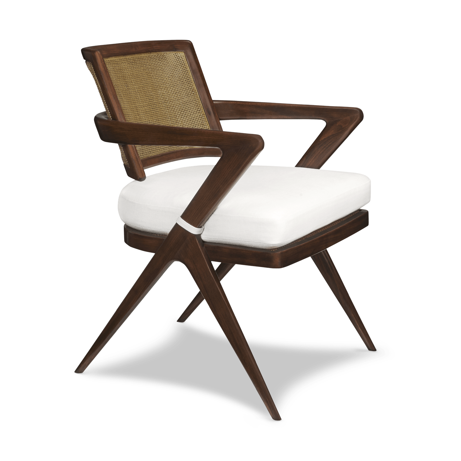Este sillón de mediados de siglo se inspira en los diseños de Pierre Jeannette. Está fabricado en madera de haya y cuenta con respaldo y asiento de bejuco, tapas de latón envejecido y un cojín que parece flotar. Tiene un respaldo cómodo y curvado, así como patas de tijera.