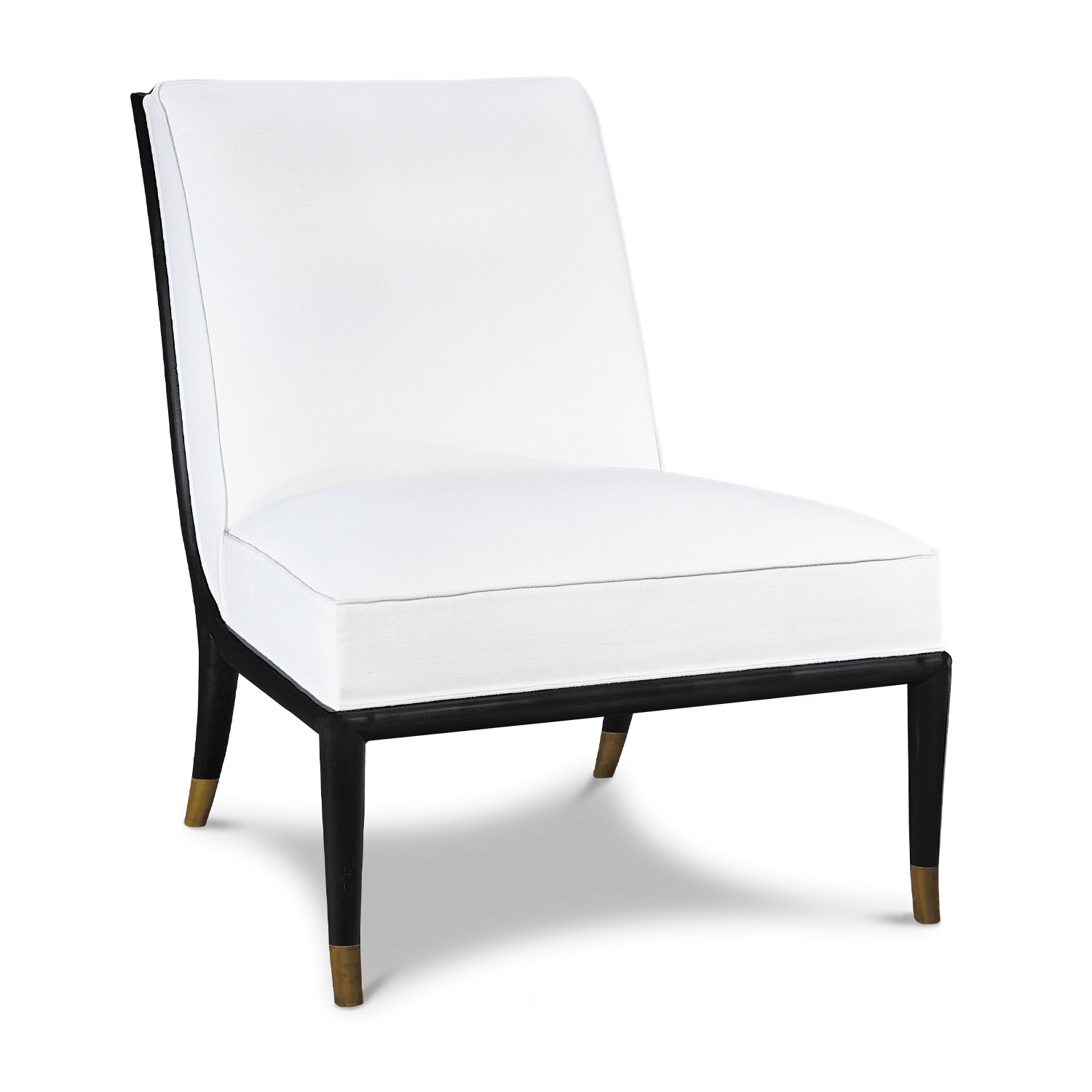 Chair influenced by French fifties, with double caned back and upholstery. Legs are simple lines with antiqued brass caps.