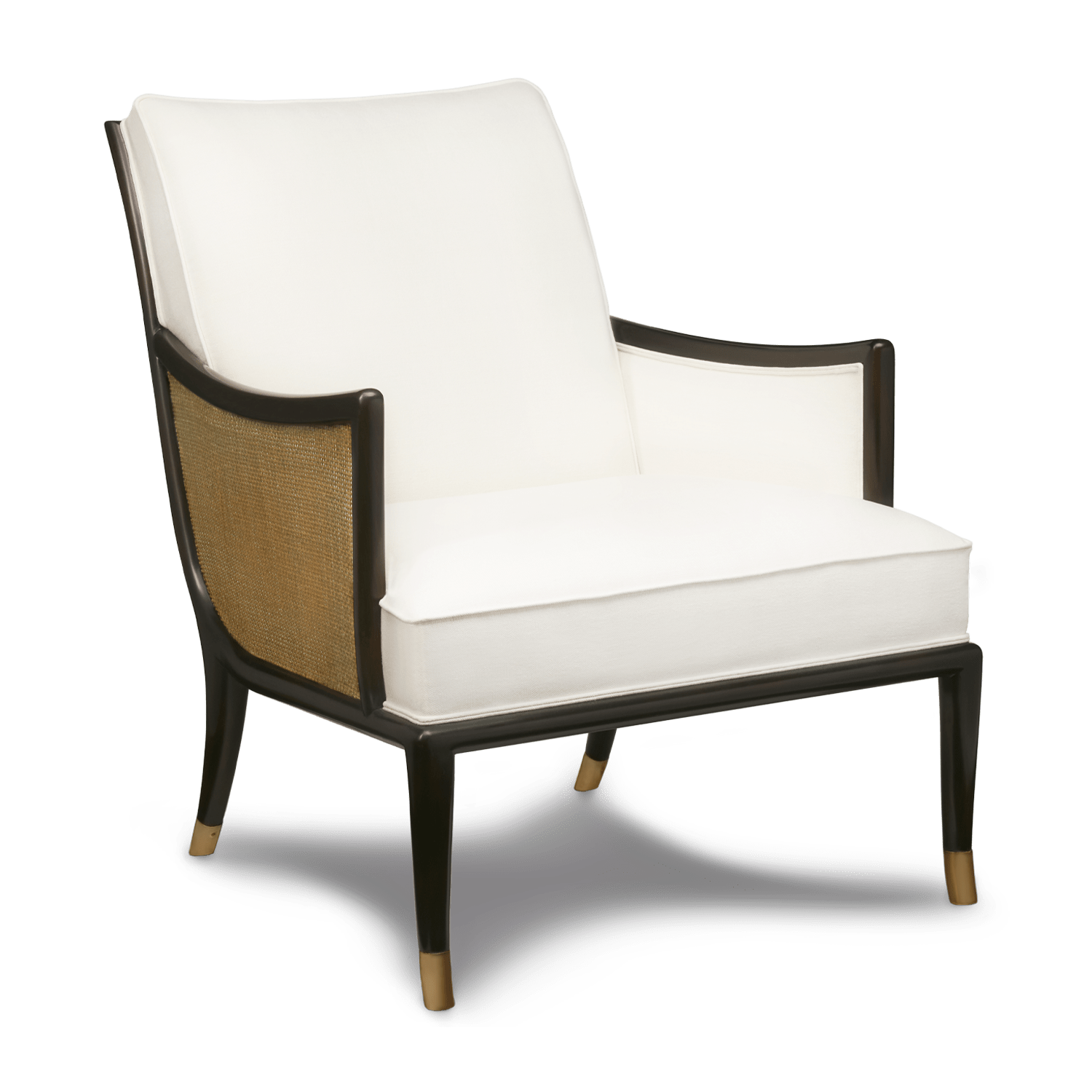 Armchair influenced by French fifties, with double caned back and outer arm, and upholstered on the inside. Legs are simple lines with antiqued brass caps.