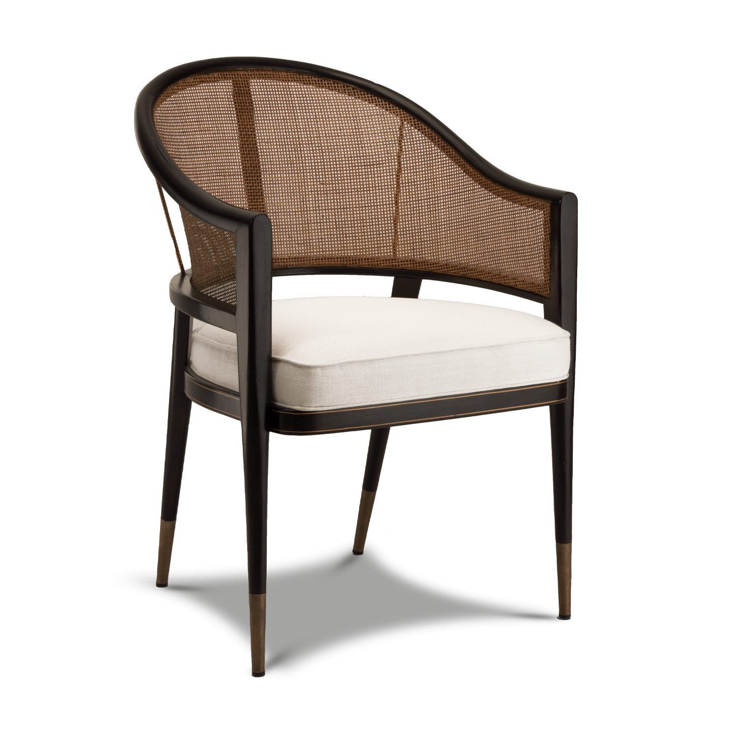 A sophisticated piece achieved with the highest level of artistry inspired by Edward Wormley. This chair features a round back with cane and delicate legs with antiqued brass caps.