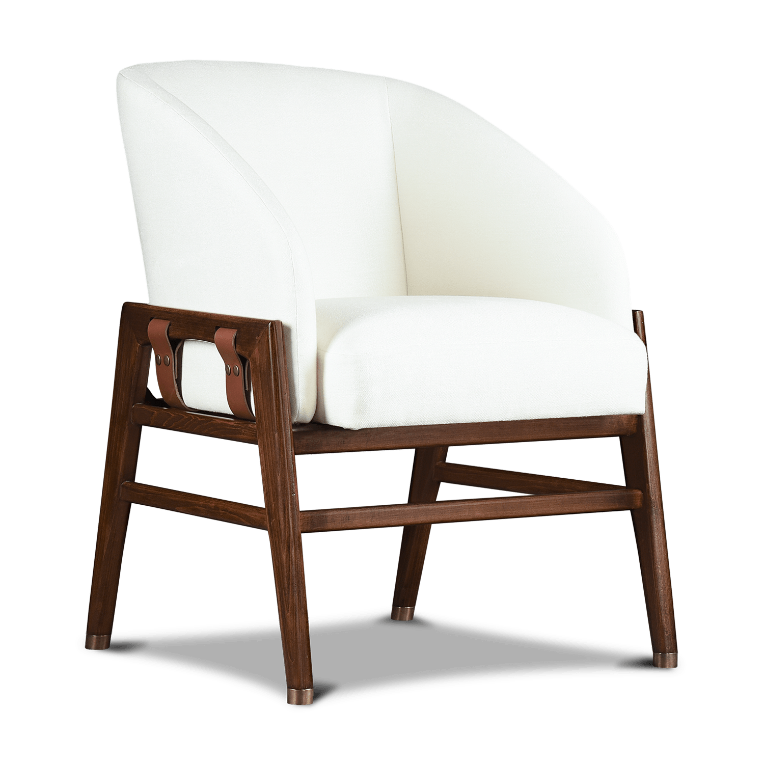 1950’s Scandinavian Design, with very subtle curves in the seat and arms, and a solid wood base with leather straps and simple legs finished with brass caps.