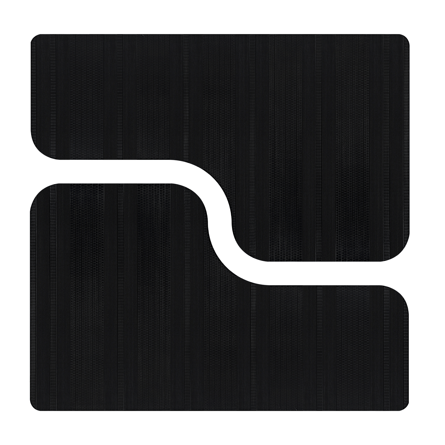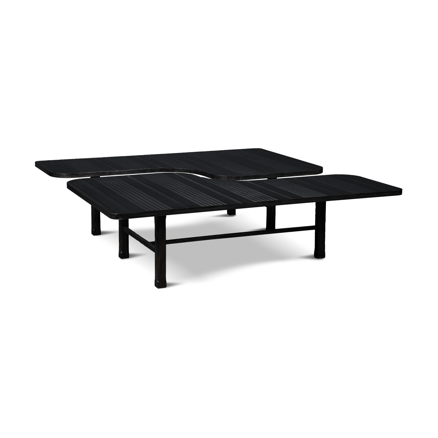 When separate, these cocktail tables have an irregular shape, but when joined they form a perfect square. The tabletops are made of dark metal with decorative lined patterns that run across its surface. The lines range in size, length and width, creating a textured effect.