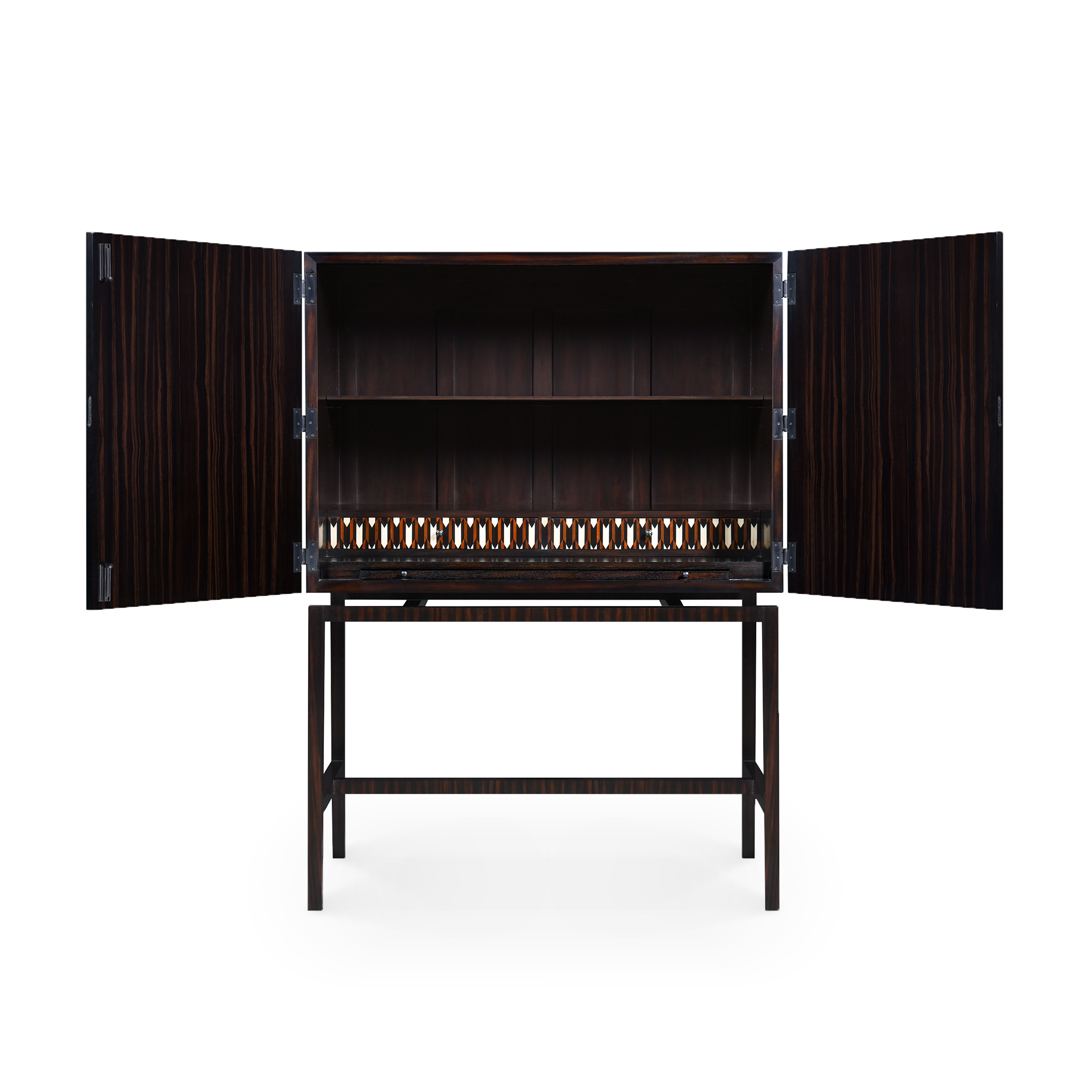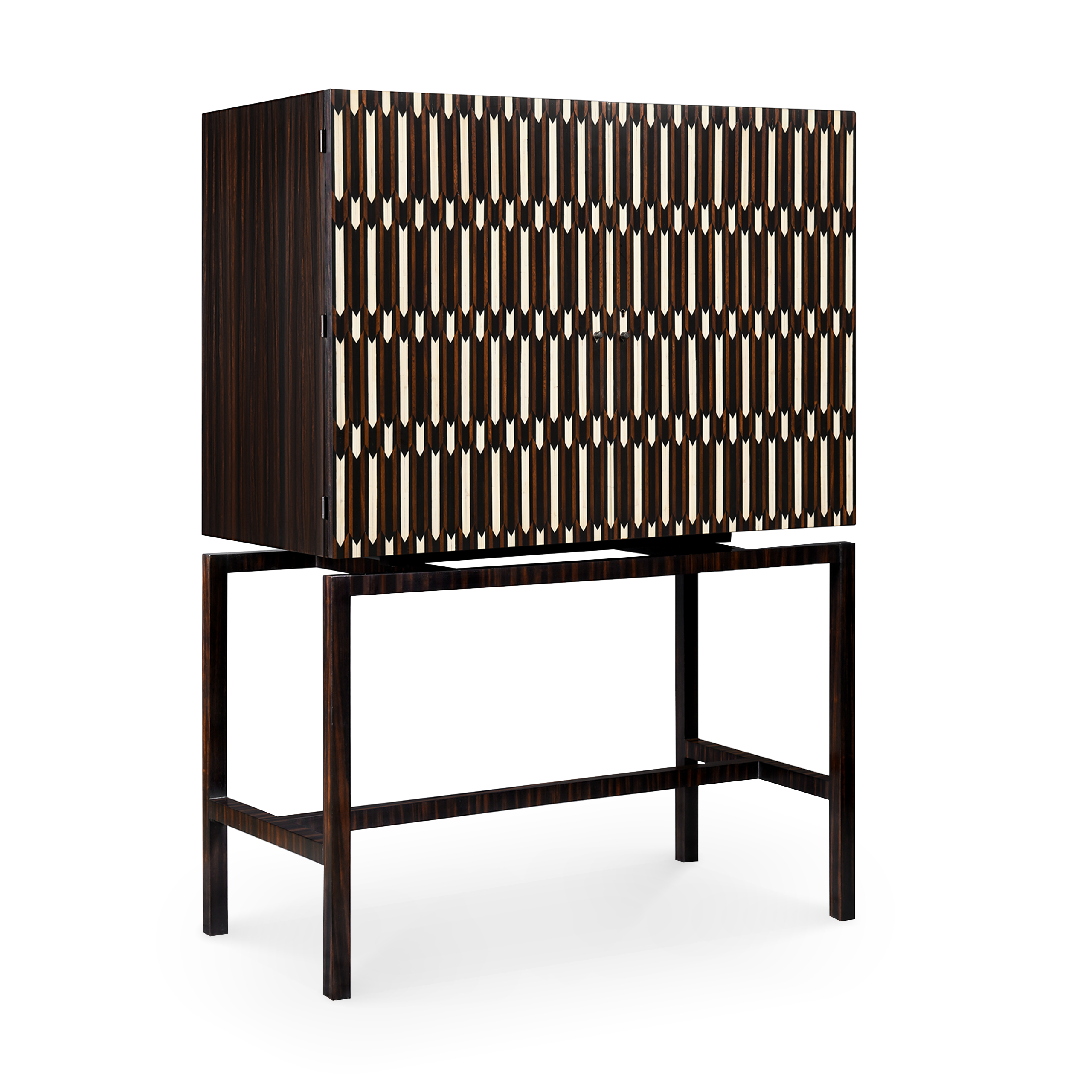 Este armario tiene un estilo contemporáneo con un intrincado diseño compuesto por diferentes tipos de madera e impresionantes incrustaciones de hueso. Su base de ébano exhibe sencillas líneas rectas que hacen perfecta armonía con el armario, que en contraste es más elaborado.