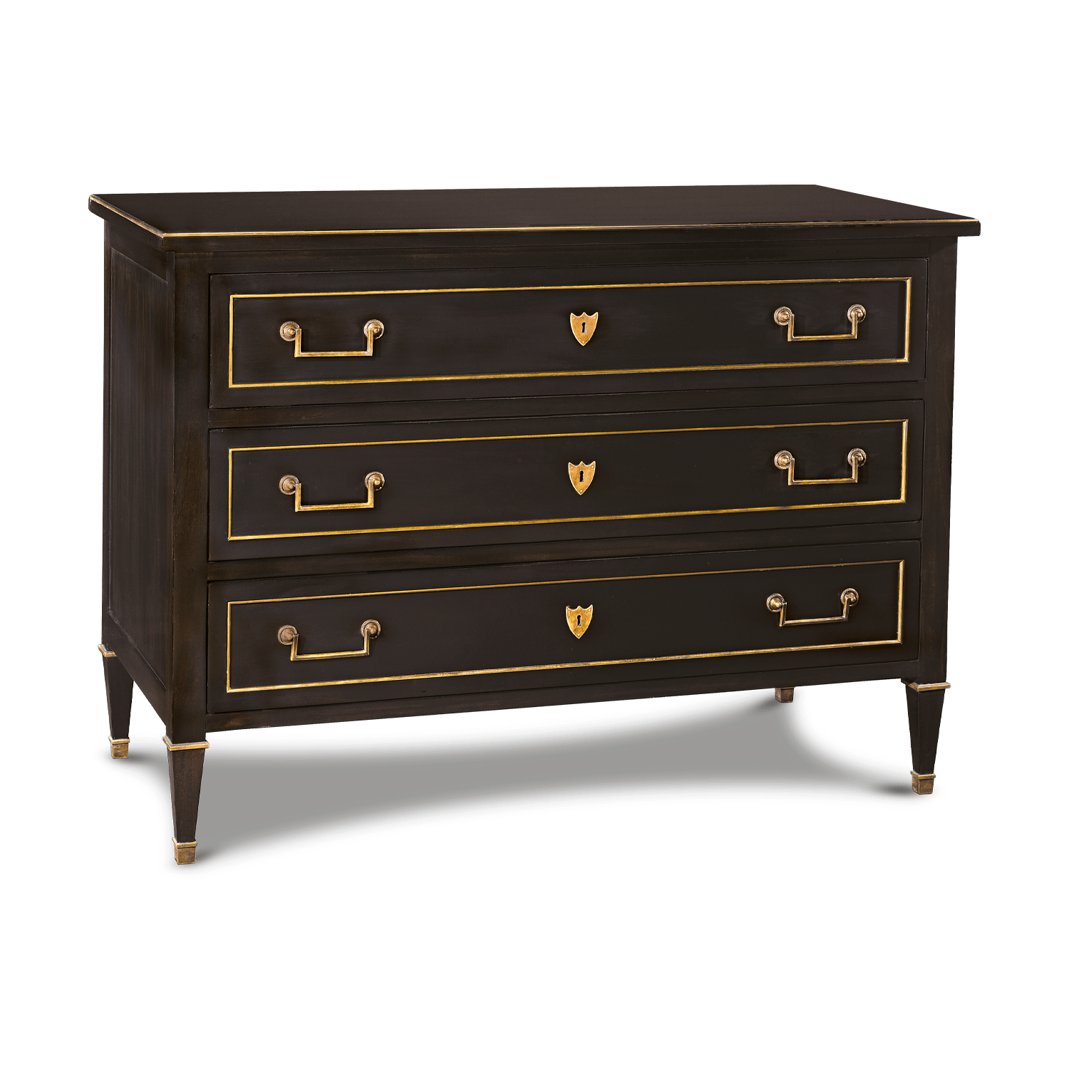 Esta cómoda neoclásica francesa, fabricada en madera ebonizada, es un testimonio de elegancia atemporal. El tono oscuro de la madera contrasta con los intrincados detalles de latón. Las incrustaciones de latón en las molduras dan un toque de opulencia, mientras que los contornos de los cajones acentúan su refinado diseño. Cada cajón está decorado con herrajes y bocallaves de latón, que no sólo ofrecen funcionalidad sino que también realzan el atractivo estético de la pieza. Los casquillos de latón en las patas, típicas de la época, añaden un extra de detalle y lujo.