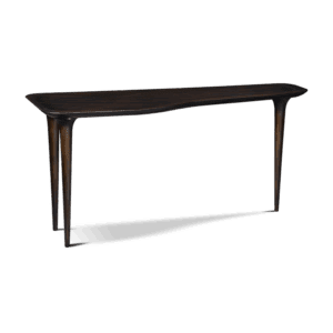 The Marceau Console with marquetry combines structural purity with a subtle graphic detail. Its ebony top is adorned with a linear marquetry of geometric patterns, a contemporary design that adds rhythm and contrast to the dark surface. The continuous curved base is joined by a brass ring, reinforcing the dialogue between form and material. A balanced, refined piece that reflects Alfonso Marina’s artisanal mastery and timeless aesthetic language.