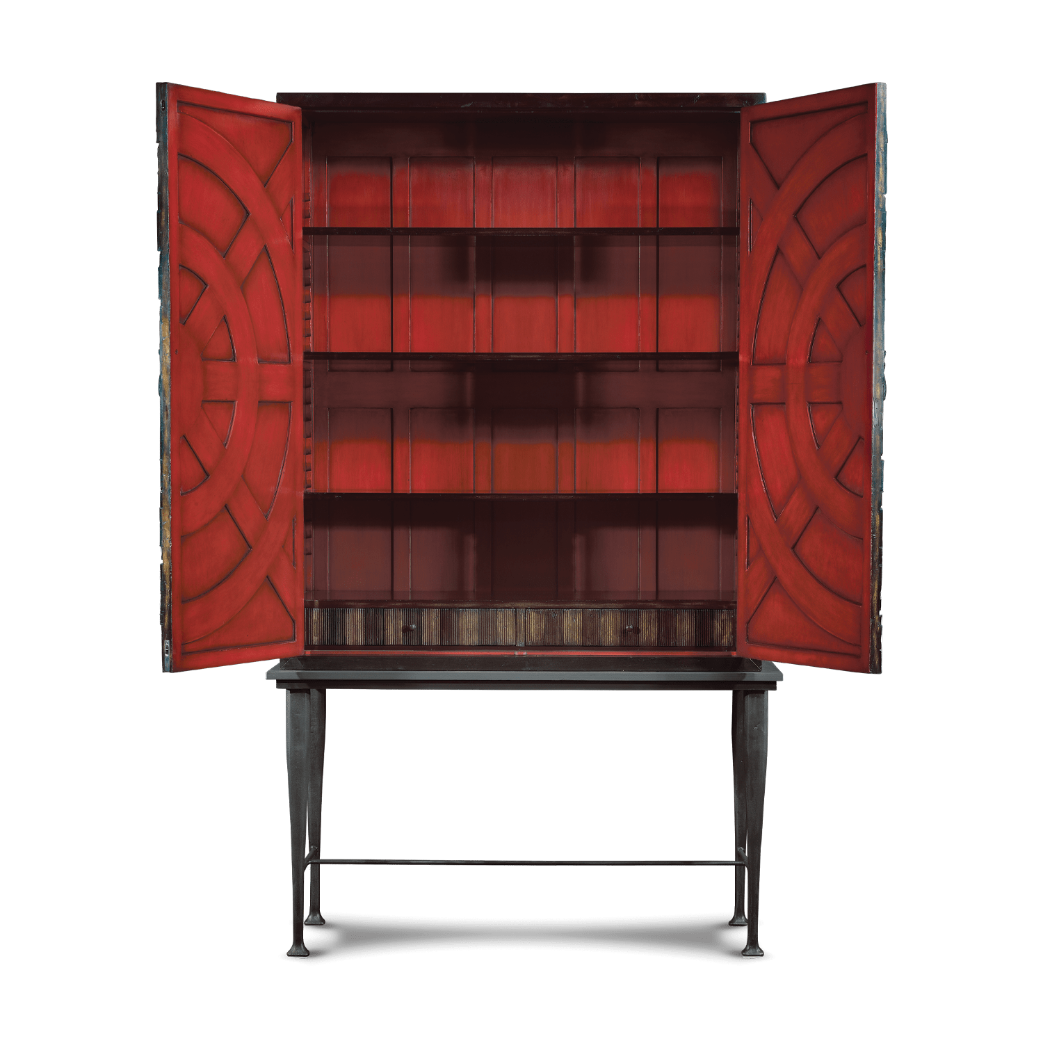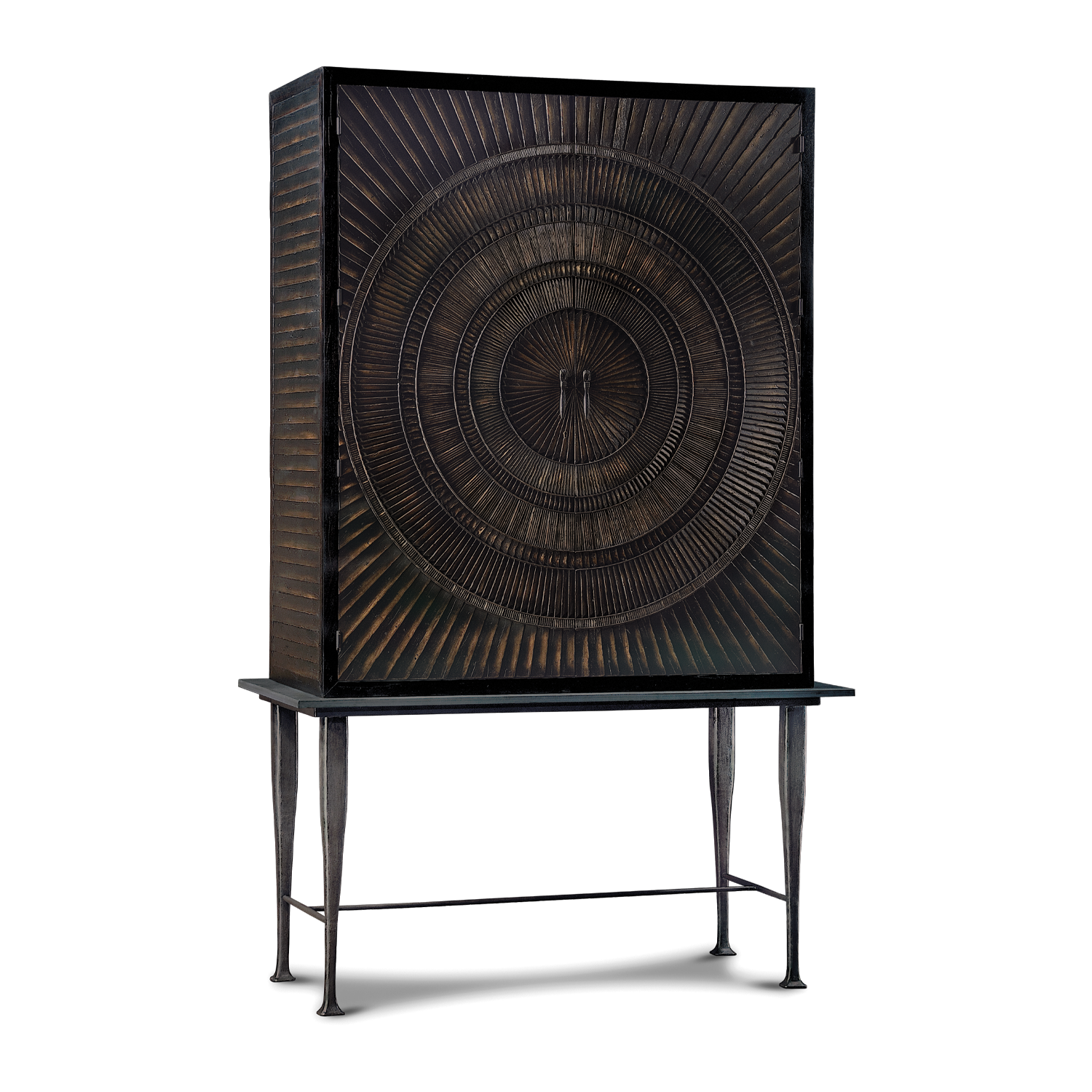 Inspirado en una turbina de reactor, el armario Villiers cuenta con 1300 piezas aplicadas a mano que decoran sus puertas, dándole su emblemático acabado texturizado. Su distintiva base de hierro se ha fundido en un molde para conseguir su forma cónica y se forja in situ en la fundición de nuestra fábrica. Tiene un tablero de pizarra y al abrir las puertas dobles, el interior está pintado y se puede entregar en una variedad de acabados diferentes.