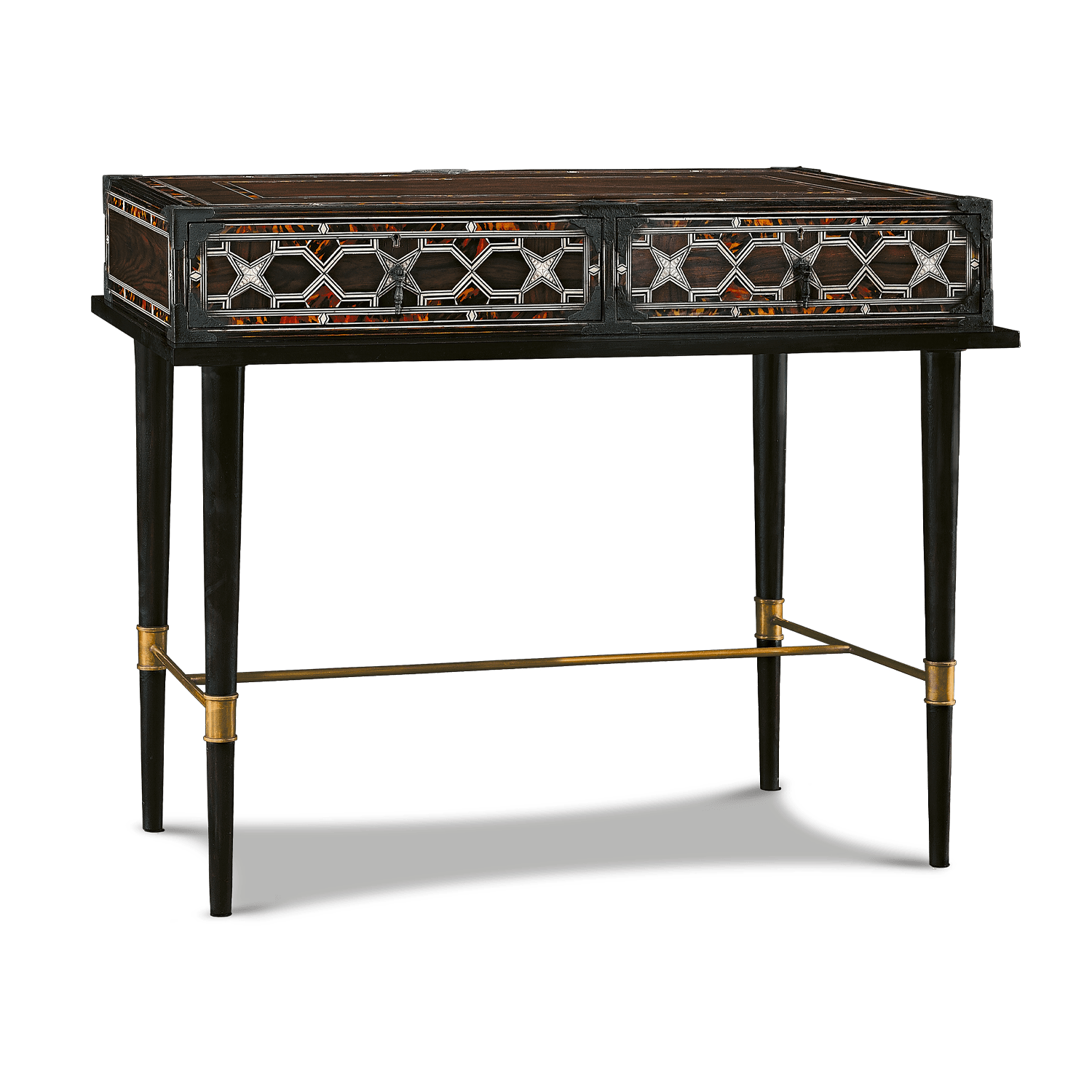 Consola Mughal diseñada con una mezcla de estilos. Su base está influenciada por el mobiliario francés de los años 50, con patas torneadas y romas con remates de latón, contrastando con una cómoda con una decoración muy geométrica utilizando chapas de imitación de carey, ébano, granadillo y hueso esgrafiado, latón envejecido y detalles de hierro.