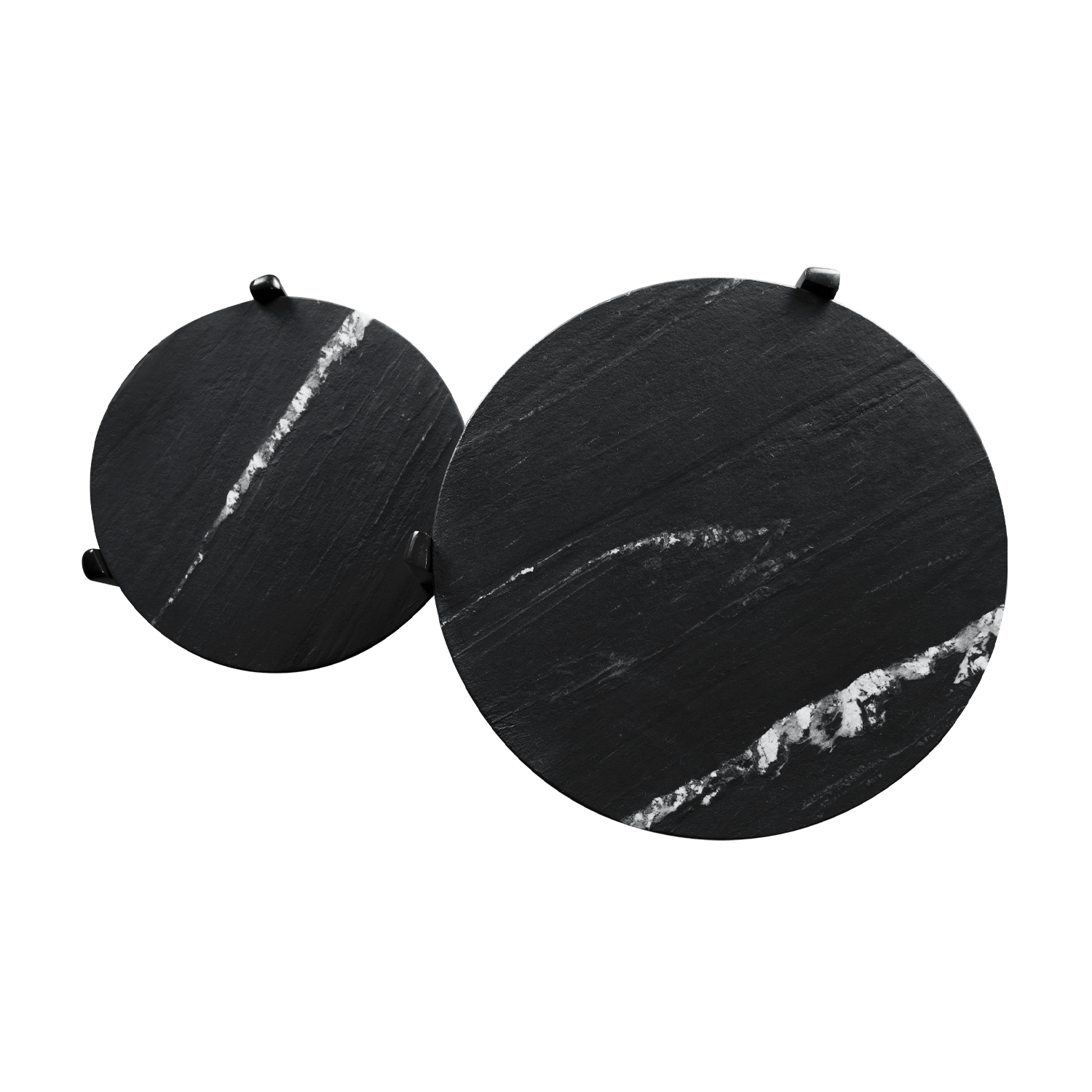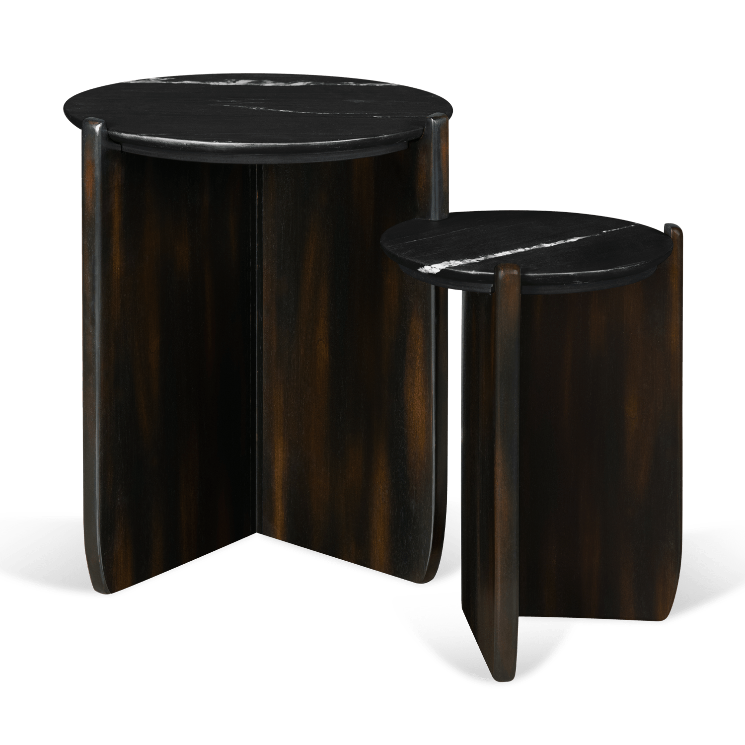 La mesa auxiliar Trento se compone de 2 bases triangulares de madera y tableros circulares de mármol. Ambas superficies están colocadas a diferentes alturas y comparten un soporte que las une.