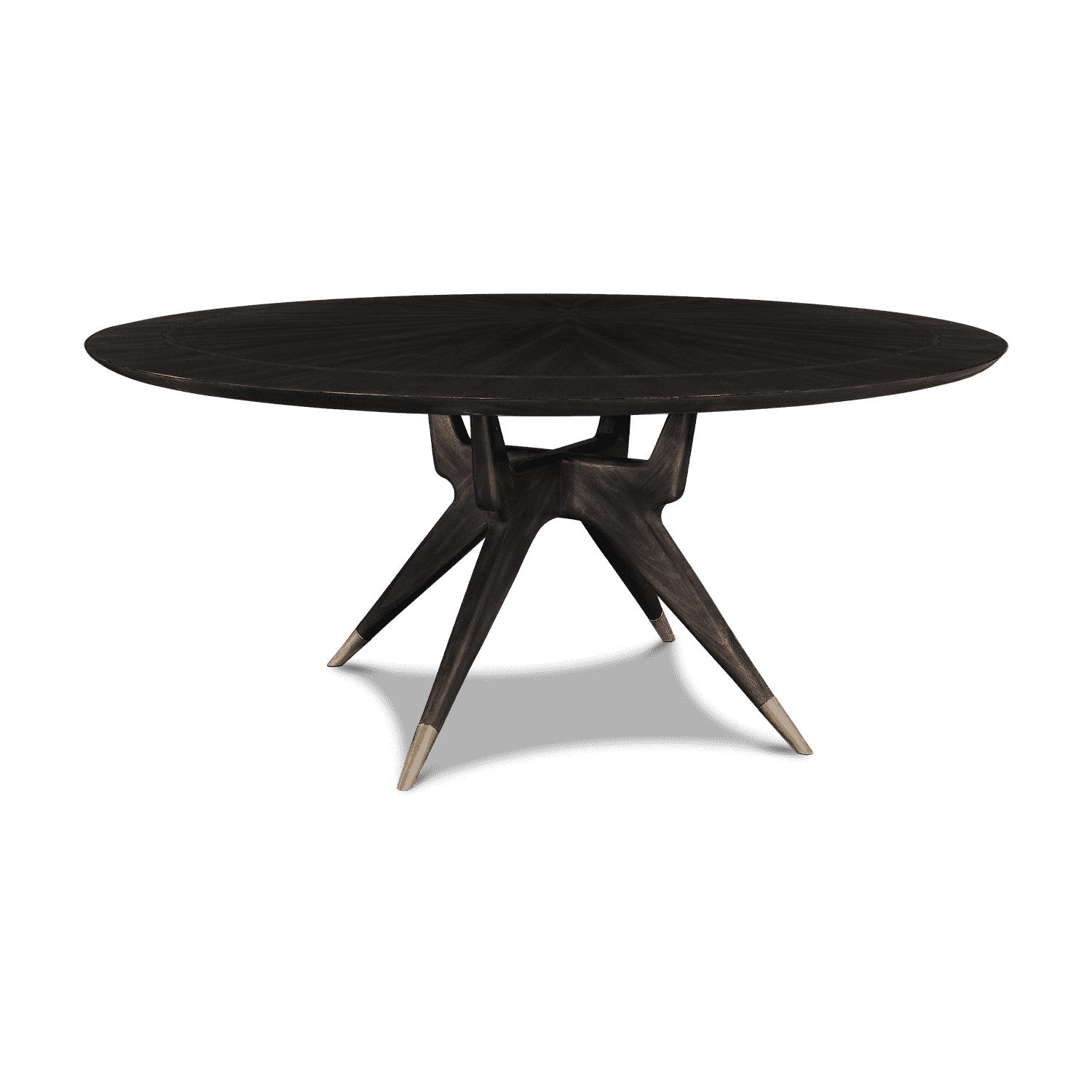 Inspirándose en el refinamiento de los años 50 en Francia, su pedestal geométrico está formado por patas romas rematadas con casquillos de latón. El tablero chapado en ébano tiene un diseño único en forma de estrella, realizado mediante una técnica perfeccionada por nuestros artesanos altamente especializados.