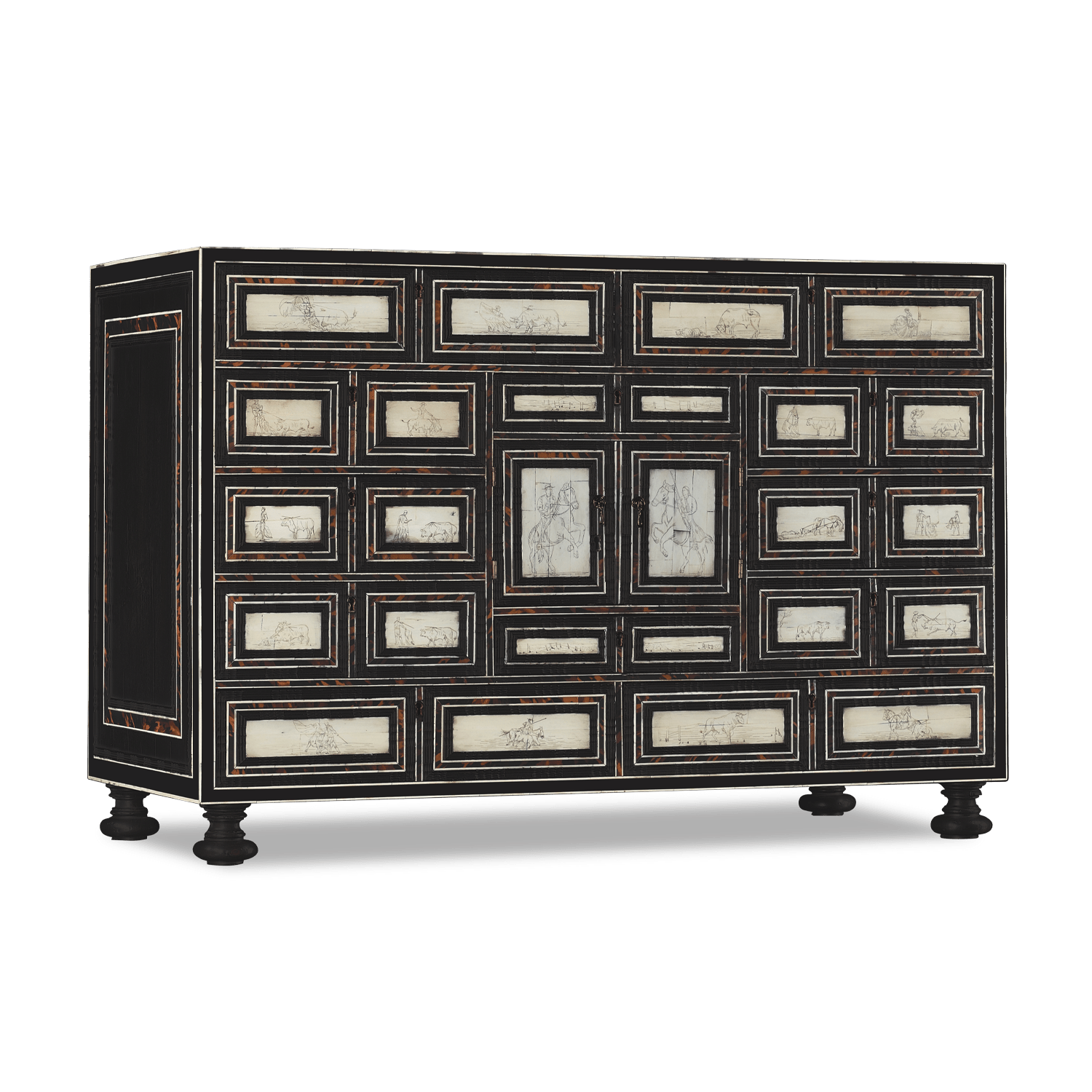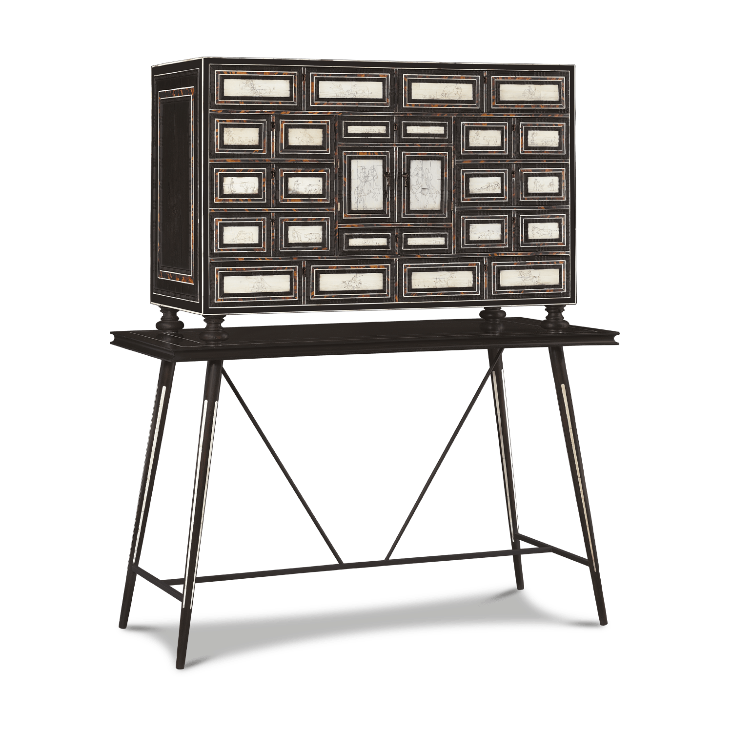 Este impresionante mueble está influenciado por los muebles del siglo XVIII con una base más contemporánea, tiene motivos taurinos esgrafiados y presenta incrustaciones de hueso y carey de imitación.