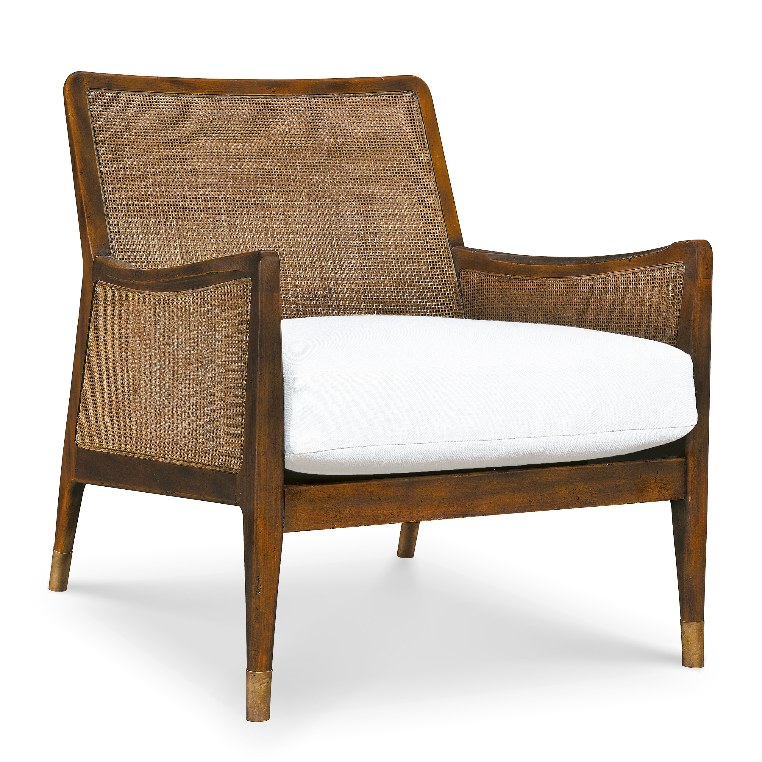Este sillón está influenciado por el diseño danés que data de 1950-1960. Tiene respaldo y brazos de bejuco, con un cojín suelto en el asiento y patas con remates de latón en los extremos.