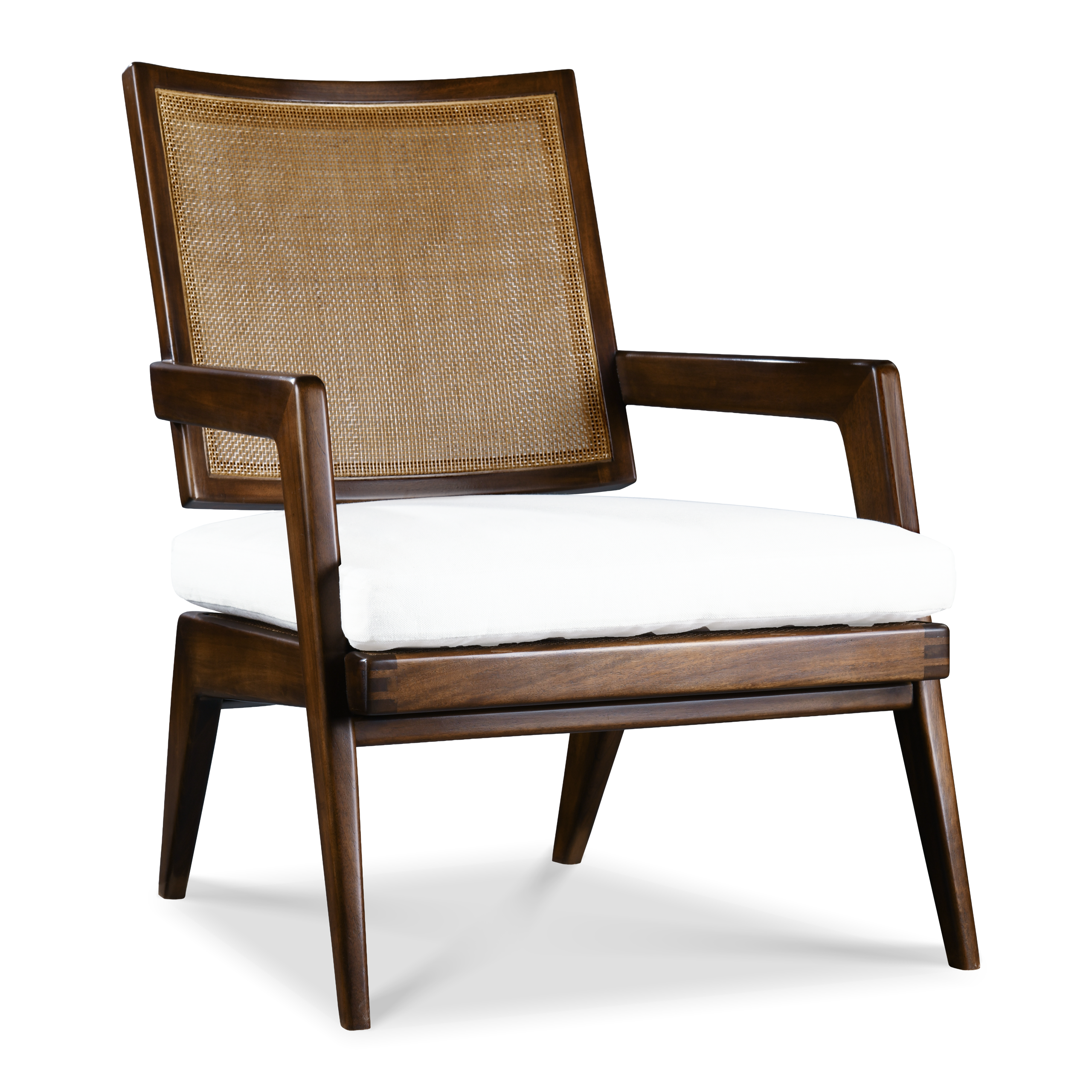 Esta pieza está inspirada en Pierre Jeanerette, nuestra versión de la silla de los años 40. Los brazos tienen el estilo típico del arquitecto; tiene un respaldo de bejuco flotante y un cómodo cojín de asiento acolchado.